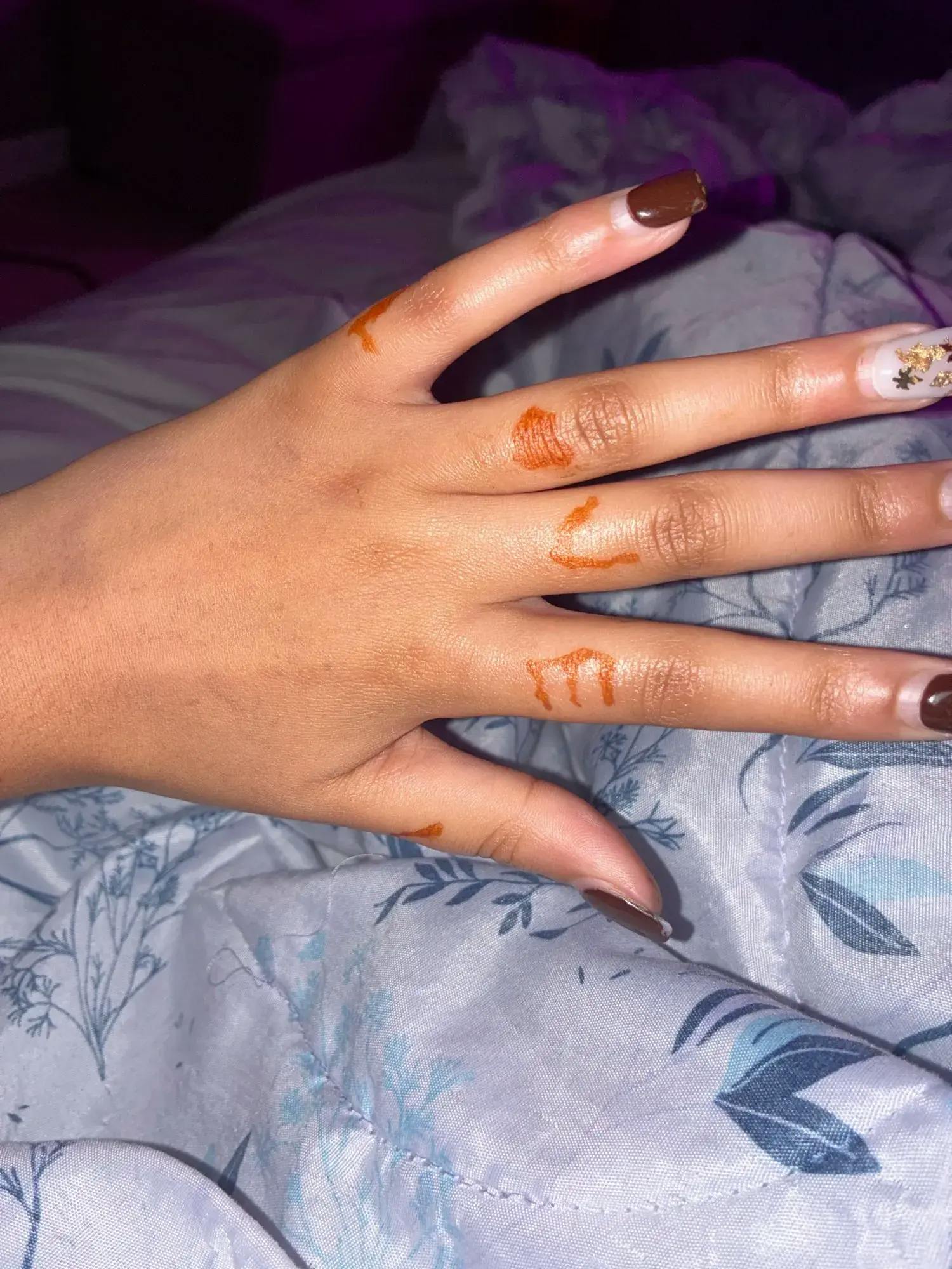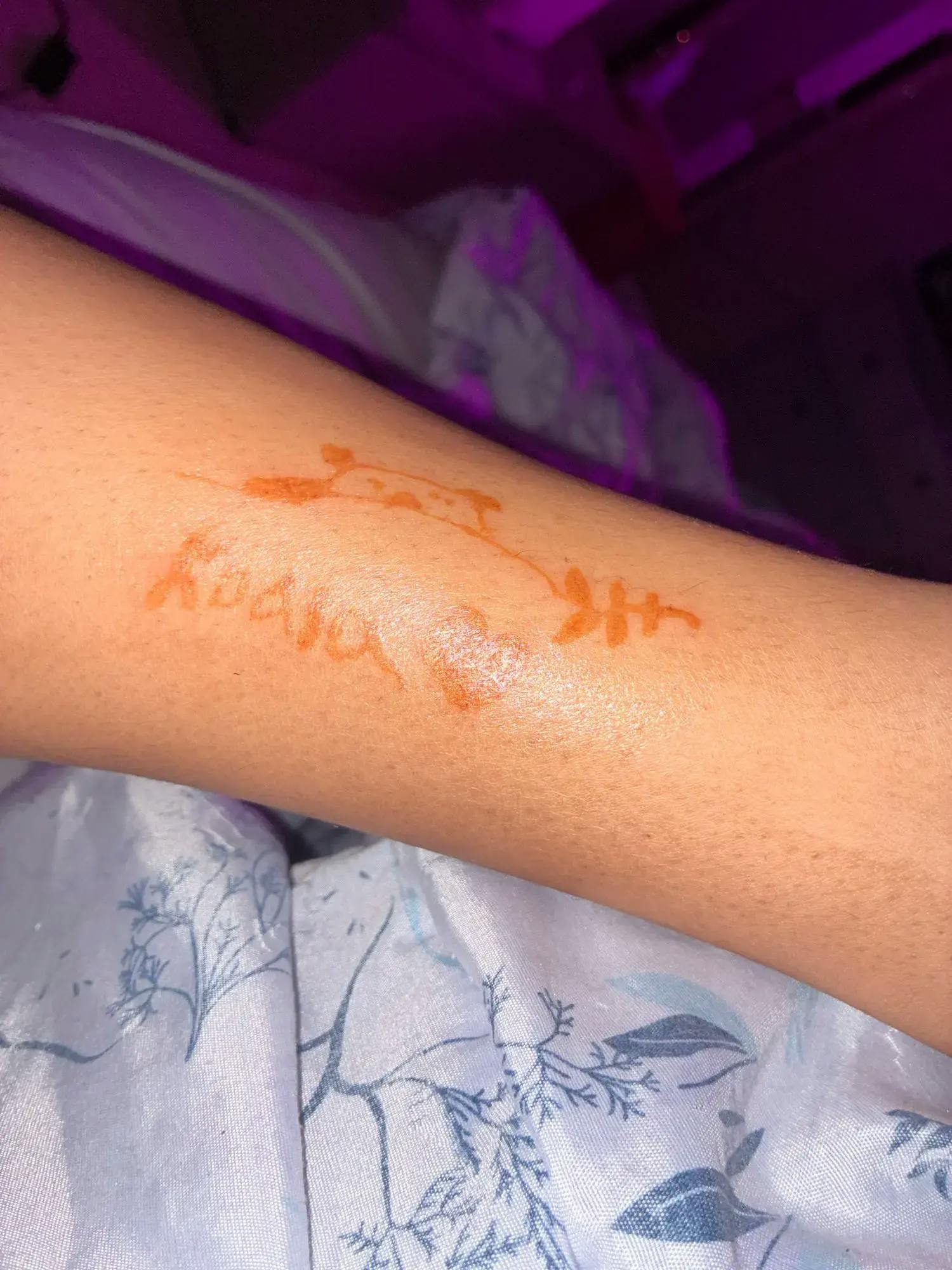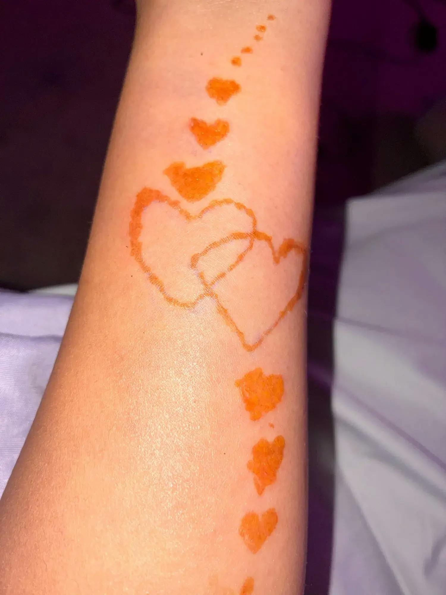 When i put the hand on, i let it stay overnight. The first picture are before i took it off and other 4 pictures were when i took it off. It looks so pretty. I love it so much. I even did more on my wrist. My fingers in my leg they look so cuteee! 🩷 😁