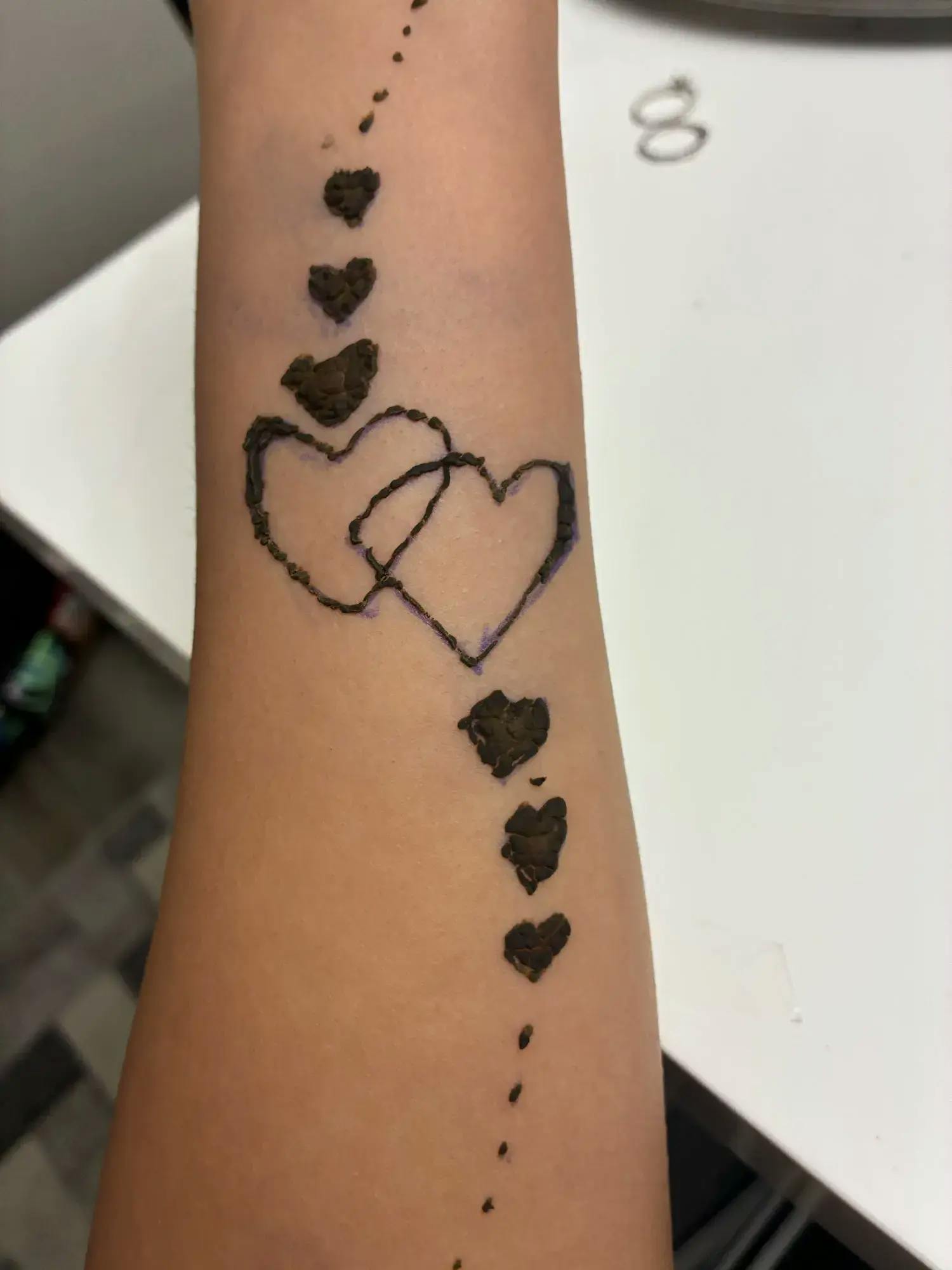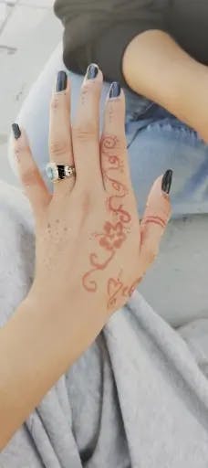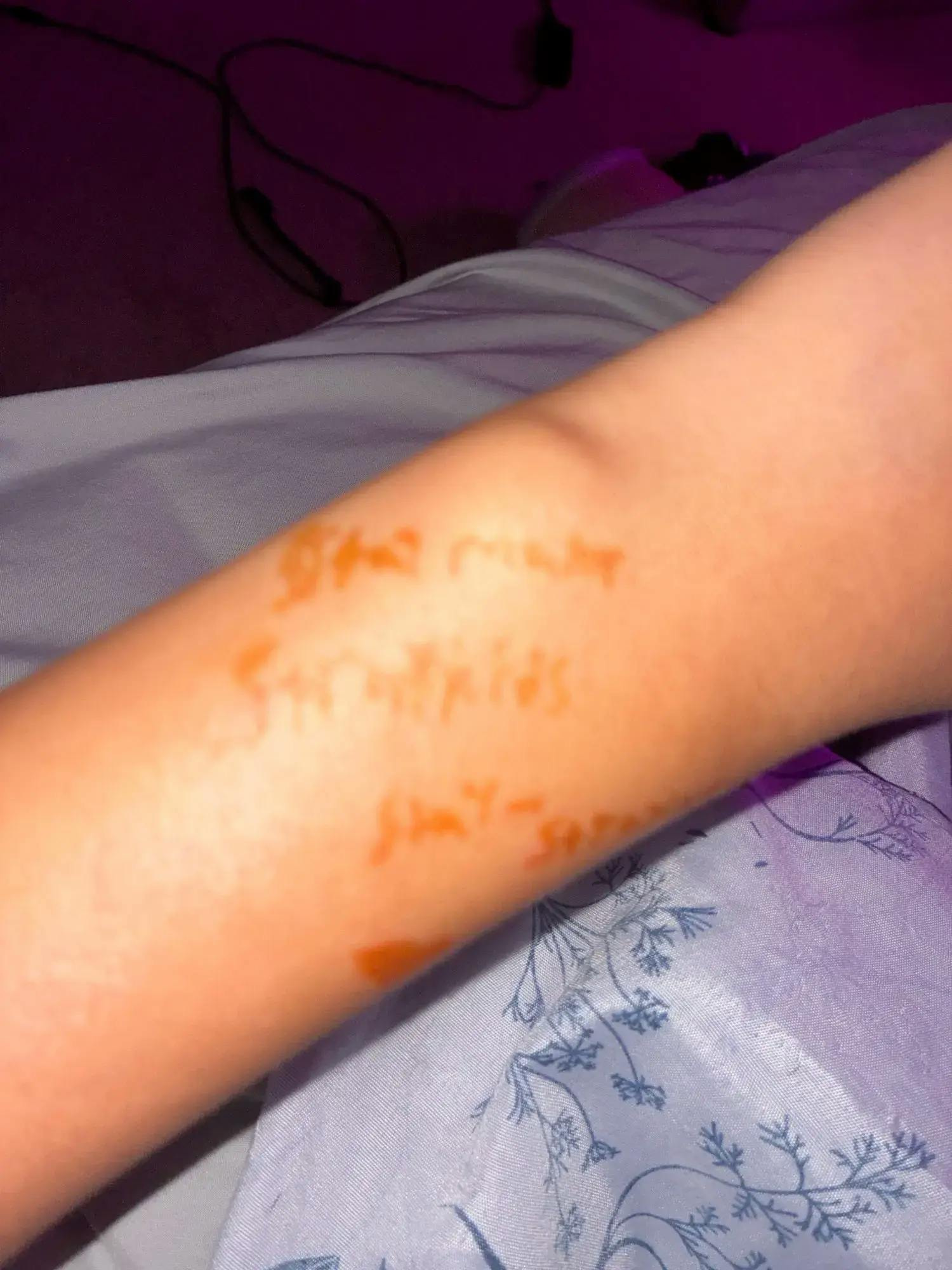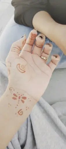 When i put the hand on, i let it stay overnight. The first picture are before i took it off and other 4 pictures were when i took it off. It looks so pretty. I love it so much. I even did more on my wrist. My fingers in my leg they look so cuteee! 🩷 😁