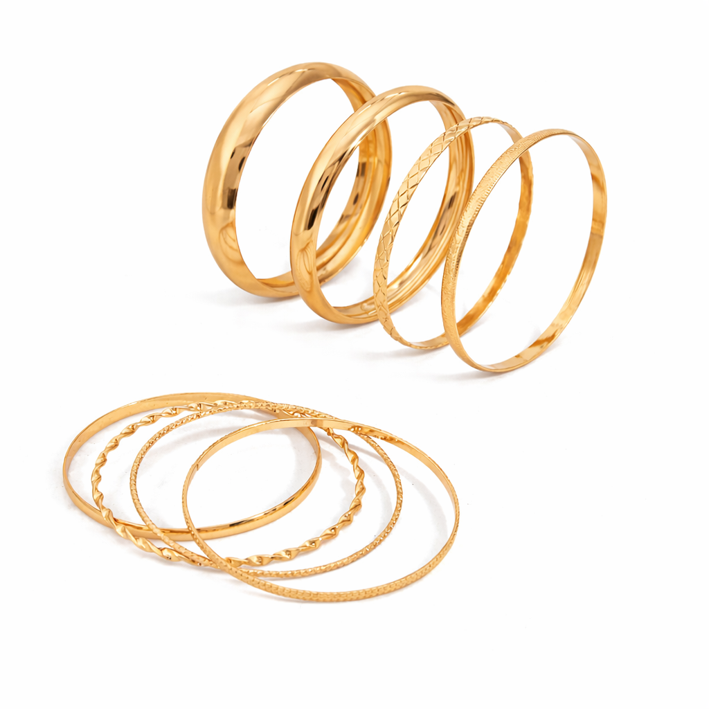 The set blends smooth, high-shine bangles with finely textured pieces, creating contrast that feels rich but never loud. Each bangle is rigid and structured, so the stack keeps its shape and sits cleanly on the wrist. The result is bold, modern, and quietly powerful.